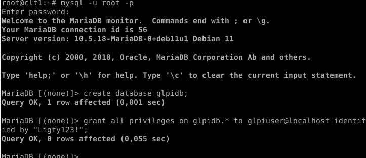 On va créer la base données qui va nous permettre d'installer GLPI et donner les droits privilégiés à l'utilisateur glpiuser sur la base de données glpidb après avoir installé MariaDB grâce à la commande apt install mariadb-server