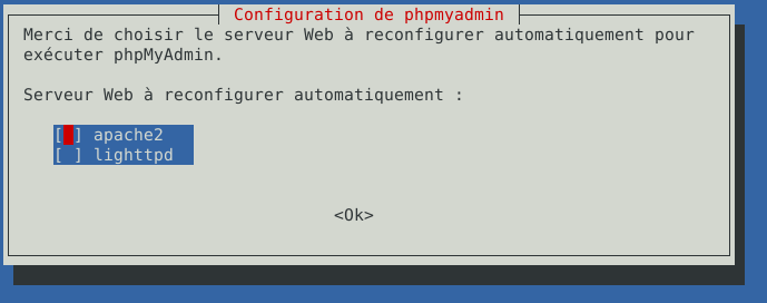 et ensuite on installe phpmyadmin et on choisit apache2 en appuyant sur la barre d'espace