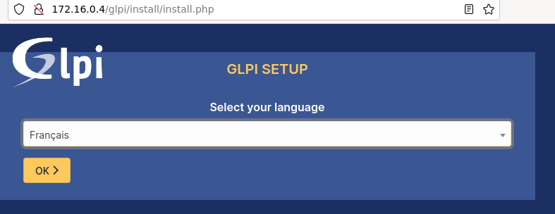 L'installation est terminée et je tape dans la barre d'adresse mon adresse IP /glpi pour avoir l'interface graphique de GLPI