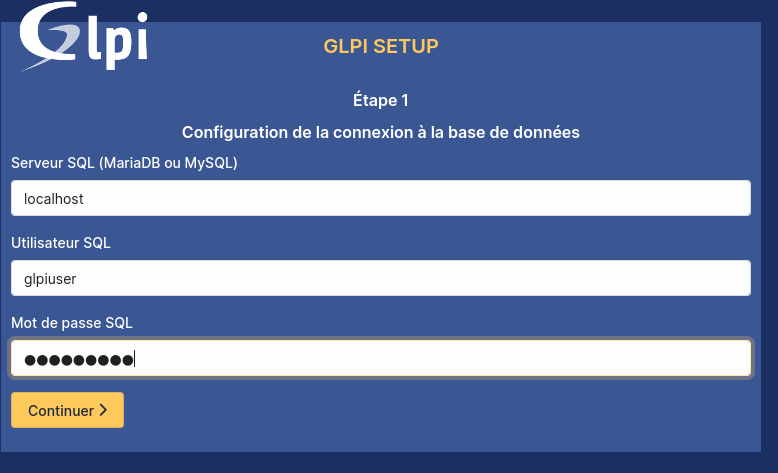 Ensuite on renseigne le serveur SQL, l'utilisateur SQL dans notre cas c'est le glpiuser et son mot de passe et je continue l'installation.