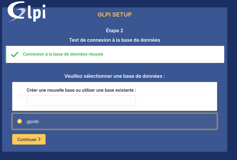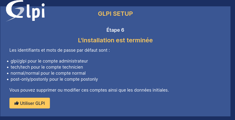 L'installation est terminé et on peut se connecter avec le compte "glpi" par défaut pour continuer notre installation