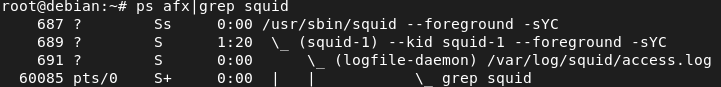 Nous allons taper la commande ps afx|grep squid pour voir si le processus tourne