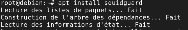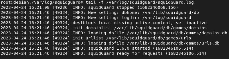 et pour finir nous allons redémarrer squid en tapant la commande systemctl restart squid et nous allons regarder dans les log de squidGuard et tapant la commande tail -f /var/log/squidGuard/squidGuard.log