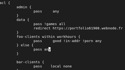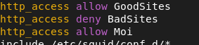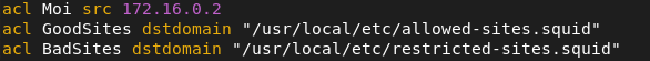 Nous allons tout d'abord créer un fichier dans lequel nous allons définir tous les sites que nous désirons bloquer et renseigner le chemin dans le fichier conf de squid et une ACL avec notre adresse IP